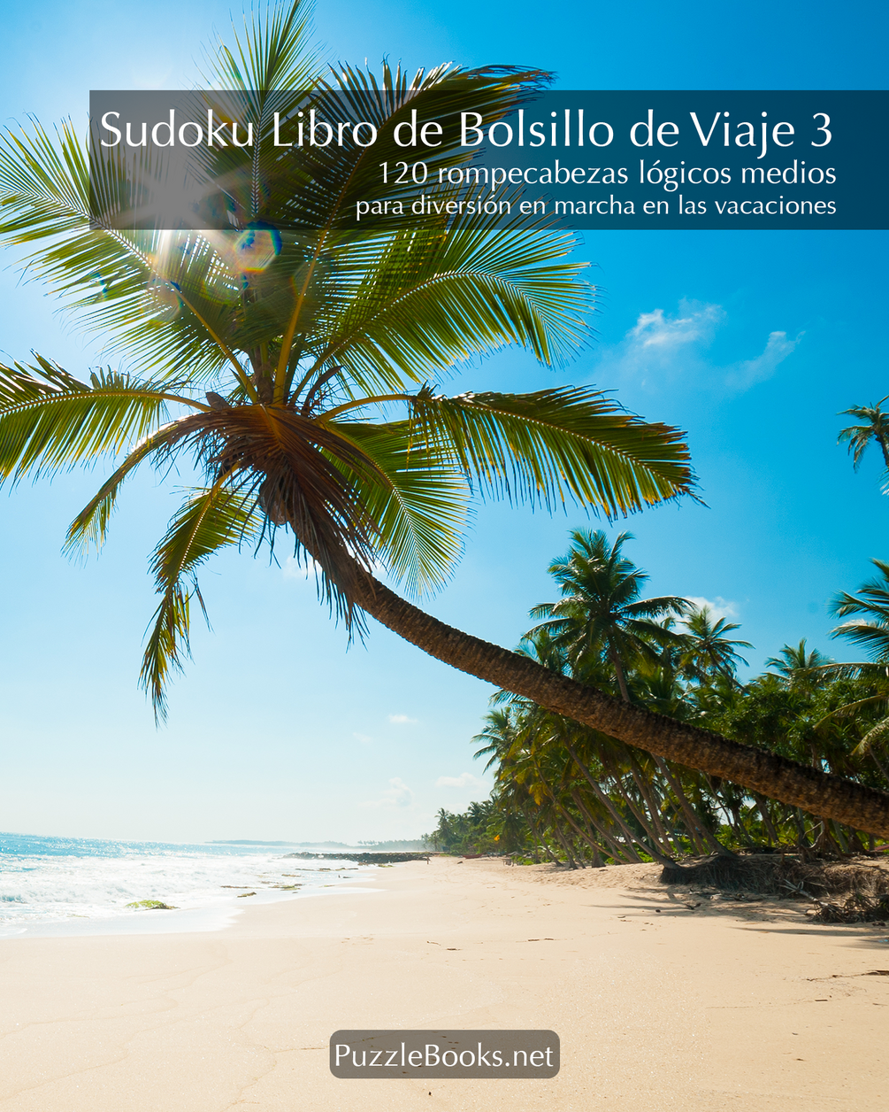 Sudoku es un pasatiempo lógico, divertido y adictivo que se ha popularizado en el mundo entero. Este libro es ideal si sabes cómo jugar al Sudoku y no te importa su tamaño, pero encuentras nuestros rompecabezas de Sudoku difíciles demasiado difíciles. Una vez que empieces con este libro, no serás capaz de ponerlo de nuevo sobre la mesa. Te hemos avisado!Tamaño portátil perfecto, pequeño para llevarlo en el bolsillo del bolso, maletín o mochila. ¡Resuelve Sudokus donde quieras!Sudoku Libro de Bolsillo de Viaje 3 - 120 rompecabezas lógicos medios para diversión en marcha en las vacaciones es una colección de 120 puzzles:• 120 puzzles Sudoku 9x9 nivel medioEl objetivo del Sudoku es rellenar las celdas vacías, un número en cada una, de manera que cada columna, fila y región contenga cada número una sola vez.Te garantizo que cada rompecabezas de lógica en este libro de pasatiempos Sudoku se ha comprobado cuidadosamente para asegurarte de que cada juego tiene sólo una solución.Ninguno de los rompecabezas en este libro aparece en ninguno de los otros libros españoles de PuzzleBooks.net.